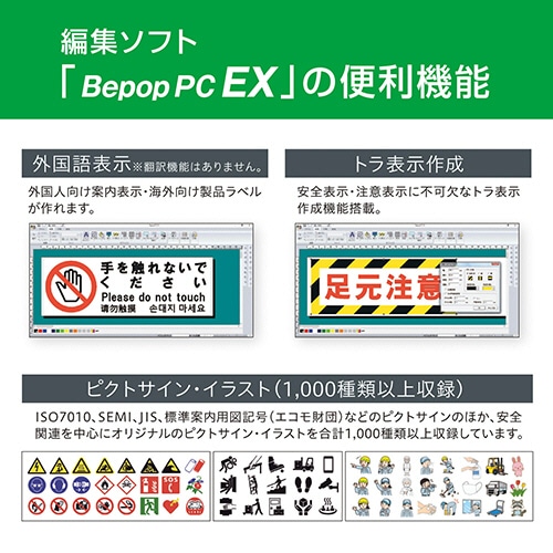 - ●案内表示・看板の作成に適したエコノミーモデル●寸法/W330×D320×H320mm●重量/9kg●印字密度/203dpi●印字速度/25mm/秒●最大作画範囲/100×2000mm●分解能/0.025mm/step●電源/AC100V±10% 50/60HZ●消費電力/85W●インターフェース/USBポート×1(Ver2.0フルスピード)●対応OS/Windows 11/10/8.1●付属品/ソフトウェアCD、スパナ、カッティングツール(刃)、カッタホルダ、取扱説明書兼保証書、お客様登録カード、ソフトウェア使用許諾書、電源ケーブル、USBケーブル、シートガイド●保証期間/1年●シリーズ名/Bepop※重量は本体のみ。※最新のOS対応状況はメーカーHPでご確認ください。●解像度203dpiのラベルプリンター。●小さなラベルから大きな表示物まで、自社で作成できます。