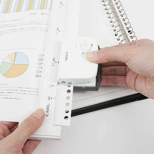 - ●自分だけのルーズリーフを作れるパンチ。●色/ブラック●穴あけ枚数/5枚●穴数/A4:30穴、B5:26穴●穴間隔/9.5mm●穴径/5.5mm●穴奥行/6.35mm●対応用紙サイズ/A4、B5●寸法/W333×D71×H13mm●材質/SPCC、ABS、PP●重量/120g●パンチサイズ/W73×D68×H63(ロック時H41)mm●パンチ重量/215g※ 寸法・重量はゲージの値。●穴あけ枚数5枚のゲージパンチ。本体色はブラックです。