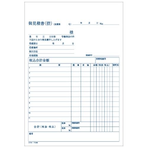 - ●ノーカーボン見積書●仕様/見積書、2枚複写、ノーカーボン複写、A5タテ●行数/11行●サイズ/タテ216×ヨコ148mm●とじ穴/2穴(幅80mm)●1パック=50組×10冊入