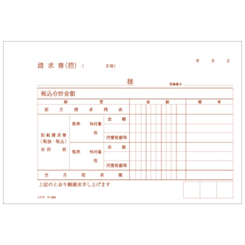 - ●ノーカーボン合計請求書●仕様/合計請求書、2枚複写、ノーカーボン複写、B6ヨコ●サイズ/タテ128×ヨコ188mm●1冊=50組●軽減(複数)税率対応のB6ヨコ型の合計請求書です。