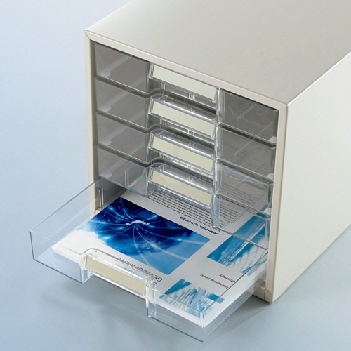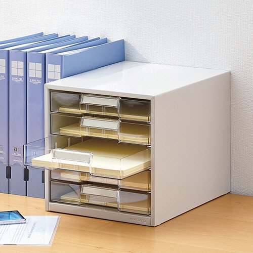 - ●透明プラスチック引き出しタイプのレターケース。A4タテに対応。●仕様/A4タテ、5段●サイズ/外寸:W256×D330×H261mm●引出し内寸/W225×D302×H40mm●材質/本体:スチール(焼付塗装仕上げ)、引出し:再生スチロール●色/ライトグレー●A4タテ、引出し5段です。