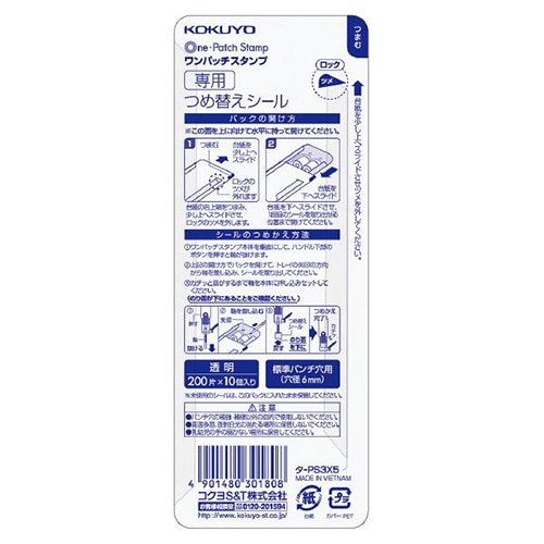 - ●つめかえ用補強シール。●仕様/替パッチ、透明タイプ●サイズ/外径:14.5mm、内径:6mm●1パック=200片×10個