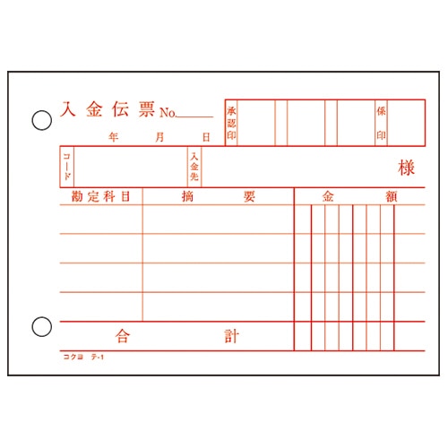 コクヨ 入金伝票 B7ヨコ型 白上質紙 100枚 テ-1N 1冊(ご注文単位1冊)【直送品】