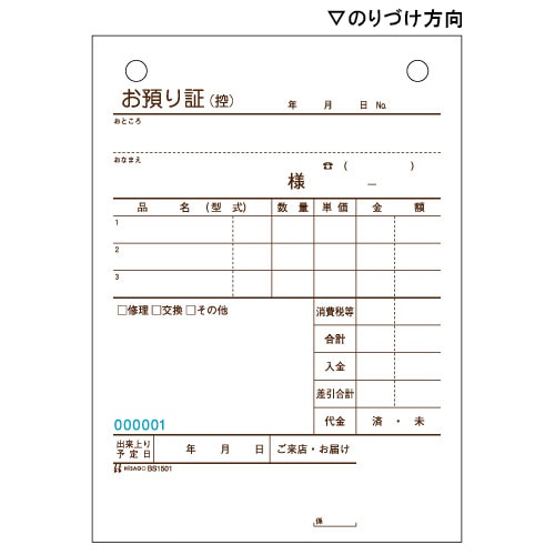 ヒサゴ お預り証 A6タテ 3枚複写 50組 BS1501 1冊(ご注文単位1冊)【直送品】