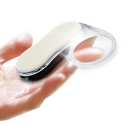 - ●回転すると点灯するスウィングルーペ。●倍率/3.5倍●寸法/W43×D12×H80mm●材質/本体:ABS樹脂製、レンズ:アクリル樹脂製●重量/38g●電池/CR2016×2個(付属)●LED高輝度ライト1灯