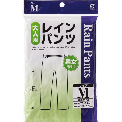 - ●急な雨の備えに。コンパクトに折りたたんで携帯できて便利。●サイズ/M●対応身長/160~170cm●胴囲/75~85cm●股下/67cm●材質/EVA・ゴム※サイズはおおよその目安です。●男女兼用のレインパンツ、Mサイズです。