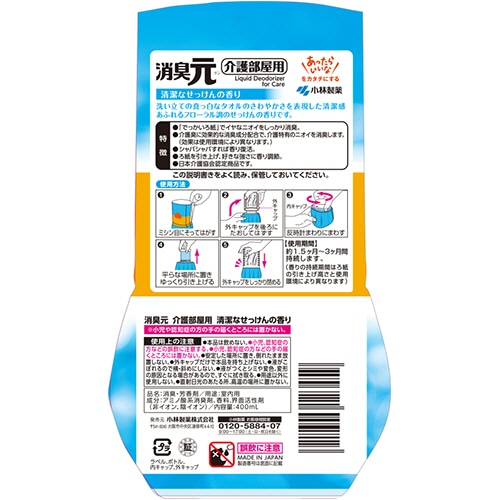 - ●介護特有のニオイを専用消臭成分が効果的に消臭します。●内容量/400ml●香り/清潔なせっけんの香り●介護部屋で多く検出される汗・体臭の原因(アルデヒド)に特化した消臭成分を配合しました。
