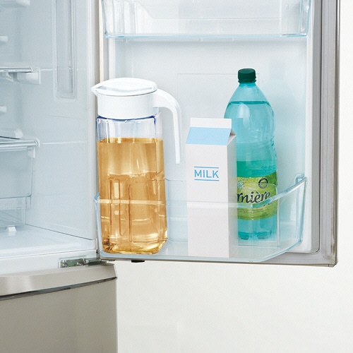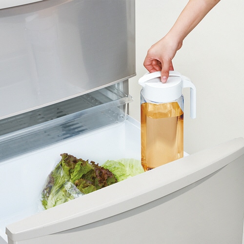 - ●タテ置き・ヨコ置き両方できる。●容量/2.1L●寸法/W152×D103×H295mm●重量/313g●色/ホワイト●材質/本体:AS樹脂、フタ・ネジ栓:PP、パッキン:シリコーンゴム●容量2.1Lの冷茶ポット、色はホワイトです。●取り出しやすい上部持ち手。