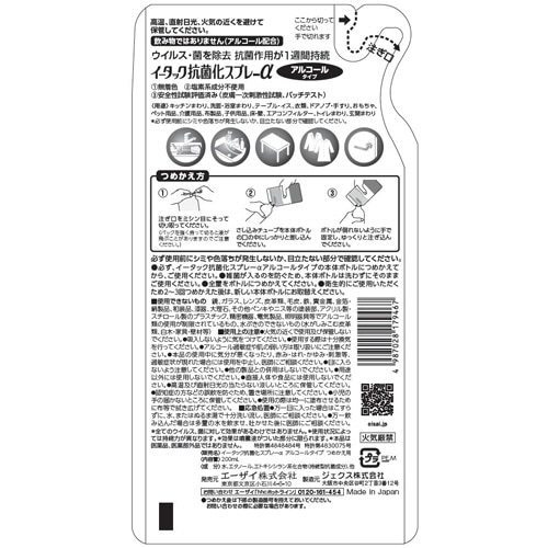 - ●ウイルス・菌が気になるところにシュッ!とスプレー。抗菌・抗ウイルス作用が1週間持続。●詰替●内容量/200ml●成分/水、エトラキシシラン系化合物(持続型抗菌成分)、可溶化剤、安定化剤●詰替※全てのウイルス、菌に対して効果があるわけではありません。※使用状況によっては持続力が異なります。※効果は噴霧液がついた部分に限られます。※本品は医薬品・医薬部外品ではありません。●持続&速乾のアルコールタイプ。つめかえ用、200ml。●身の回りの気になるところにスプレーすることで、持続型抗菌成分によりウイルスや菌を寄せ付けません。●水洗いしても取れにくく、水拭きしても作用は1週間続きます。●無着色・塩素系成分不使用。●菌による気になるニオイを抑えます。●Etakは、特許取得の持続型抗菌成分です。(特許番号第4830075号)
