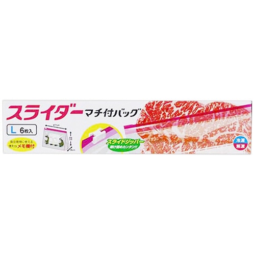 - ●スライダージッパーで開け閉めカンタン。食品管理に使える便利なメモ欄付。●サイズ/L●寸法/タテ240×ヨコ270mm●マチ片面/40mm●材質/ポリエチレン●耐熱温度/70℃●耐冷温度/-30℃●1パック=6枚●Lサイズ、6枚入です。
