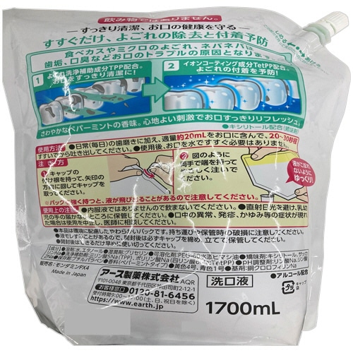 アース製薬 モンダミン ペパーミント 大容量パウチ 1.7L 1パック(ご注文単位1パック)【直送品】