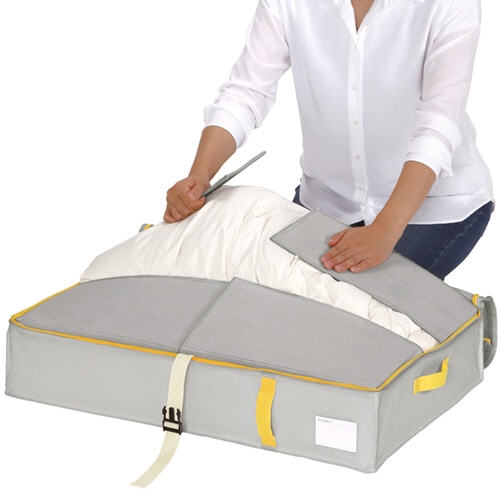 - ●羽毛布団が約2分の1に!●仕様/すきま用●寸法/約W700×D500×H140mm●色/グレー●材質/本体:ポリプロピレン、芯板:紙●クローゼットにぴったりなすきま用の布団収納ケース。