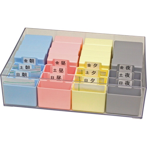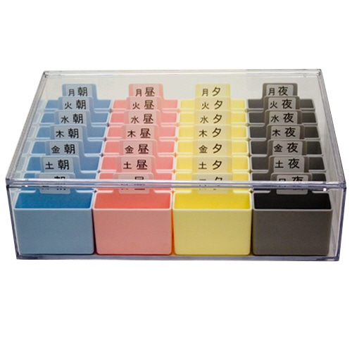 - ●1週間分のお薬がひと目でわかります。●種類/1週間分●収納数/28ポケット●サイズ/約W321×D243×H92mm●材質/本体・フタ:スチロール樹脂、中子:ポリプロピレン●飲み終わった分の小分けケースは横に倒しておけば、一目でわかります。●透明のフタ付。●朝昼晩夜の1週間分の全部で28ポケット。●一回分ずつ小分け、整理しておくことで、飲み忘れを防げます。●カプセルだけでなく分包タイプもOK。