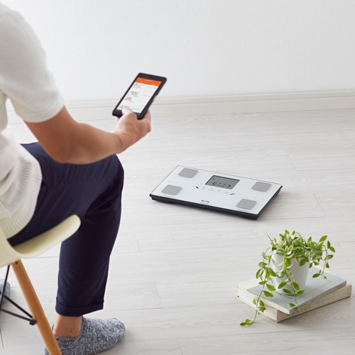 - ●スマートフォン通信対応エントリーモデル!アプリで管理できる体組成計●種類/体組成計●測定項目/体重、体脂肪率、BMI、内臓脂肪レベル、筋肉量、基礎代謝量、体内年齢、推定骨量●最大計量/150kg●最小表示/0~100kgまで:100g、100~150kgまで:200g●登録人数/5人●電源/DC6V 単4形アルカリ乾電池(LR03)×4本●寸法/W316×D217×H27mm●重量/約1.5kg(乾電池含む)●色/パールホワイト●材質/ABS、PE、強化ガラス、ステンレス●付属品/取扱説明書(保証書付)、お試し用電池(単4形アルカリ乾電池(LR03)×4本)●保証期間/1年●色はパールホワイトです。●iPhone・Androidスマートフォンと連携。Bluetooth通信に対応し、対応のiPhone・Android端末にデータを転送。アプリでデータ管理ができます。(対応スマートフォンを必ずご確認ください。)●コンパクトながら薄型ワイドタイプだから、安心して乗りやすく、置き場所も省スペース。●乗るだけで測定ができる「乗るピタ機能」を搭載。●立てかけ収納OK。●登録人数は5人まで可能です。●測定値が大きな文字で表示されます。(文字高29mm)●測定の継続状況に合わせて表情が変わり、毎日の測定をサポートするマイサポ機能。
