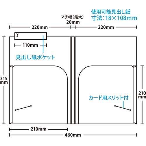 - ●カルテをしっかり収納できる大きなポケットが好評。●仕様/A4ヨコ、ダブルポケット●サイズ/315×460mm●シート厚/0.2mm●材質/再生PP50%●1パック=50枚入※見出し紙は付いておりません※印刷物はよく乾かしてから入れてください。印刷物によっては化学反応を起こし、変形する場合があります。●ダブルポケットタイプなので、カルテや伝票を両サイドのポケットに分けて収納できます