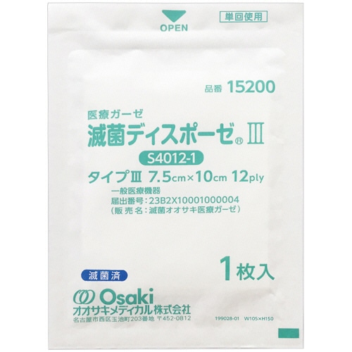 オオサキメディカル 滅菌ディスポーゼIⅡ S4012-1 7.5×10cm 12PLY 個包装 367186 50枚/箱(ご注文単位1箱)【直送品】