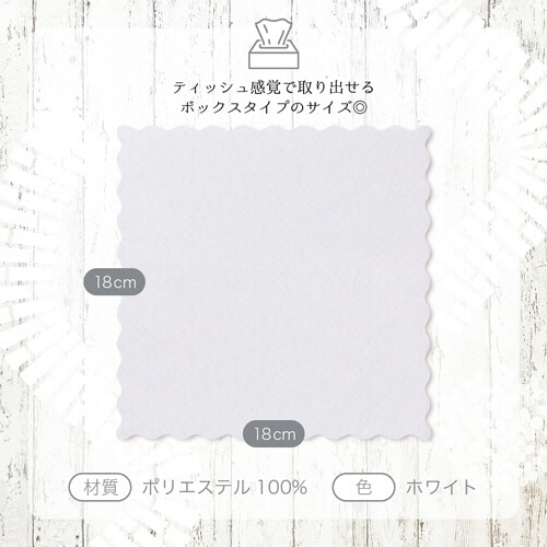 - ●汚れがスッキリ落ちる●シートサイズ/180×180mm●パッケージサイズ/W200×D110×H80mm●材質/ポリエステル100%●色/ホワイト●使い切り●ティッシュ感覚で、取り出せるボックスタイプ。18×18cm・ホワイト20枚入です。●ちょっとした汚れが気になるときに手軽に使えます。●超極細繊維が汚れの間に入り込み、しっかり汚れをつかんで離しません。油汚れやホコリ取りに好適です。●料理中に飛び散る油や調味料を拭くのにも便利です。●抜群の吸水性があり、水滴を素早く拭き取ります。●湿らせて使うこともできます。その場合、固く絞ってからお使いいただくと汚れが効果的に落とせます。