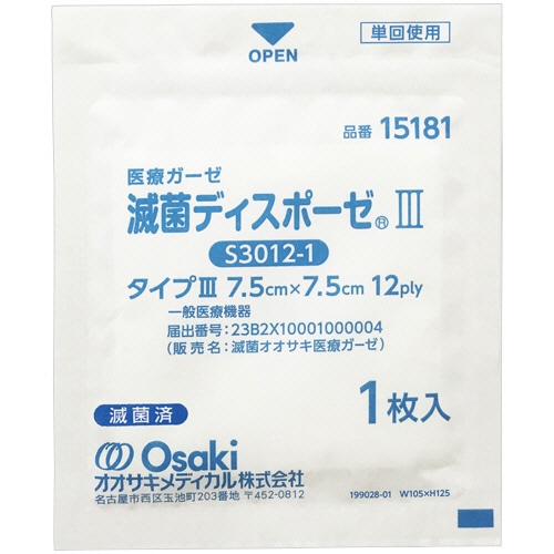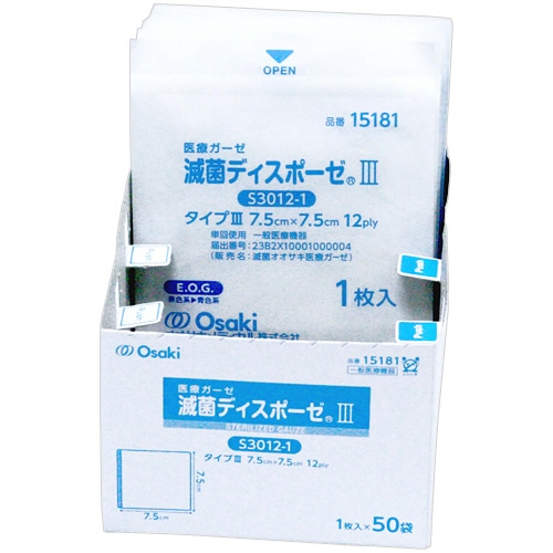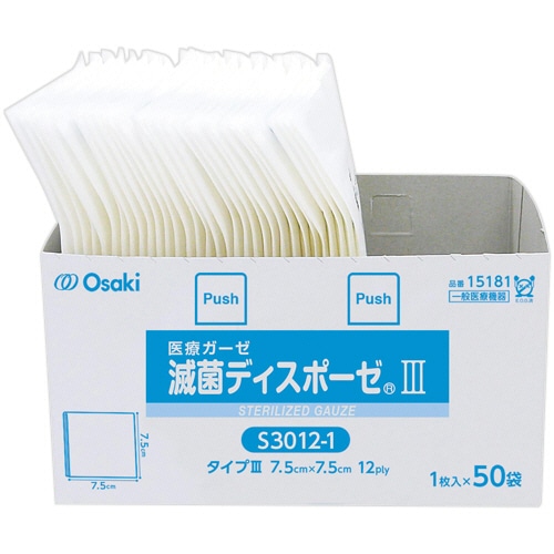 オオサキメディカル 滅菌ディスポーゼIⅡ S3012-1 7.5×7.5cm 12PLY 個包装 367184 50枚/箱(ご注文単位1箱)【直送品】