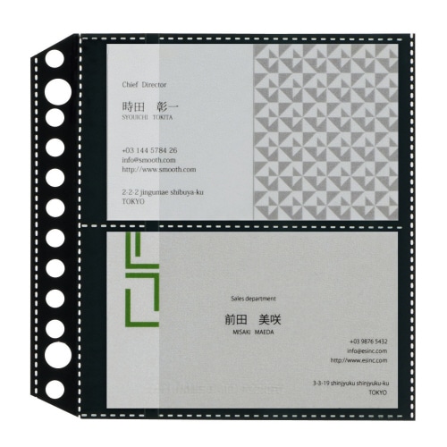 - ●名刺が引き立つ黒台紙!後からちょっと追加したいときに便利な「ちょい足しポケット」●色/黒●寸法/W123×H122mm●収容枚数/片面2枚、両面4枚●収納タイプ/両面・サイドイン●対応穴/12穴および80mm2穴兼用穴(多穴バインダーの任意の位置にセットできます。)●材質/マットタイプPPシート●1パック=10枚