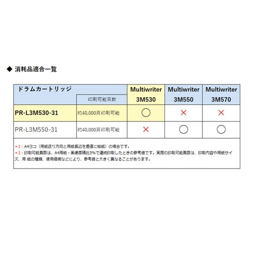 - ●メーカー純正レーザープリンタ用ドラムカートリッジ●種類/純正ドラムカートリッジ●色/ブラック●印字可能枚数/約40000ページ●品番/PR-L3M530-31※印刷可能枚数は、A4用紙・画像面積比5%・片面連続印刷したときの参考値です。