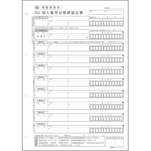 - ●採用から退職までのマイナンバーの取得・管理に好適!●サイズ/A4●複写枚数/2枚●カーボン/ノーカーボン●1冊=10組●従業員および扶養親族の番号を従業員個人別に世帯単位で取得し、管理・保管することができます。●従業員の扶養親族が、扶養から外れた際には個人番号部分のみを切り離すことができますので、台帳そのものを廃棄せずに該当者の個人番号のみを廃棄することができます。●国民年金第3号被保険者の番号を従業員経由で取得することを想定して、委任状を兼ねる形式をとっています。●2枚目裏面で番号法の求める利用目的の明示および本人確認(番号確認・身元確認)に必要な文章を掲載してありますのでこれ1枚で適法にマイナンバーの取得事務が行えます。