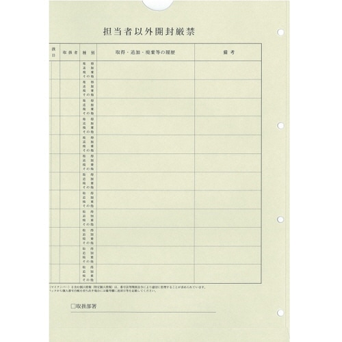 - ●個人番号台帳兼届出書(日本法令/マイナンバー2-1)および扶養親族分の本人確認書類等を世帯単位で保管・管理できる専用封筒です。●サイズ/A4●1冊=10枚●個人番号台帳兼届出書(日本法令/マイナンバー2-1)の社員情報欄のみ見えるようにカットを入れてありますので、中身を取り出さずに誰の書類であるかを確認することができます。●封筒には利用記録を記載できる管理表を設けてありますので、個人番号の取得、利用、廃棄などの番号法の求める利用記録を記載することができます。