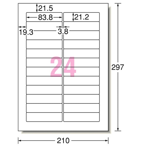 - ●いろいろなプリンターに対応して便利な、マルチプリントタイプのラベル用紙●シートサイズ/A4(210×297mm)●ラベルサイズ/83.8×21.2mm●面付け/24面(2列×12段)●紙質/上質紙●坪量/125g/平米●総厚み/130μm●ラベルの厚み/70μm●入り数/1冊(15シート・360片入)●棚板などへの表示に適した、横に長細いタイプのラベル用紙です。