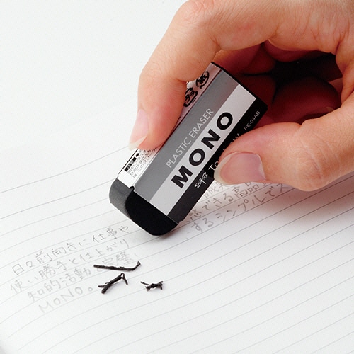 - ●汚れにつよいブラックボディの消しゴム。●色/ブラック●寸法/W17×D11×H43mm●材質/消しゴム:PVC(フタル酸エステル不使用)、スリーブ:再生紙●重量/11g●シリーズ名/MONO●用途/事務・製図用●1パック=2個※寸法・重量は1個あたり●定番のMONO消しゴムのブラックタイプ、2個パックです。消しゴムについた汚れが目立たず、消しクズが見やすいので掃除も簡単。●定番の白いMONO消しゴムと同配合の消しゴム。強力な消字性能や消し心地はそのままです。●光沢のある銀色インキを使用した、銀・白・黒の3色ストライプデザイン。MONO消しゴムのデザインイメージをそのままに高級感をプラスしました。