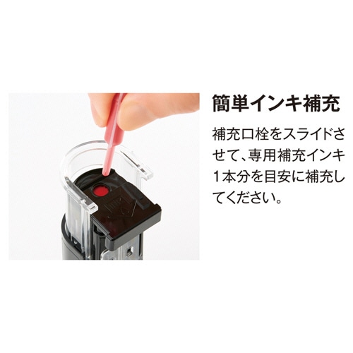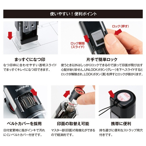- ●片手でそのまま簡単になつ印!キャップを外す手間なく「名前」と「日付」をスタンプ。キャップ紛失の心配もありません。●サイズ/15号●印面サイズ/Φ15.5mm●インク色/赤●インク種類/油性顔料●本体色/ブラック●重量/44g●寸法/Φ32.6×33.1×104.8mm●付属品/補充インキ(0.2ml×2)●専用補充インキ/XLR-GL※本体のみです。マスター部(印面)は付いておりません。●「いつ」と「誰」がひと捺(お)しで明記できるデーターネームEX15号のキャップレスタイプ。本体色はブラック、インキ色は赤です。●なつ印枠に合わせやすい透明スライドでまっすぐキレイになつ印できます。●使うとき以外はしっかりロックできるので誤って印面が飛び出す心配がありません。UNLOCKボタン(グレー)を下へスライドするとロックが解除され、LOCKボタン(黒)を押すとロックが掛かります。●日付変更時に指がインキで汚れにくいベルトカバーを採用。●マスター部(印面)の取り替えができるので経済的。(マスター部(印面)は付いておりません。)●ストラップ用穴付きで携帯に便利。