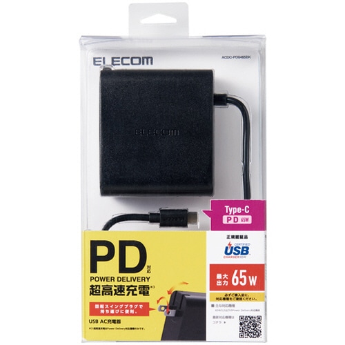 エレコム PowerDelivery対応USB AC充電器(65W) ブラック ACDC-PD0465BK 1個(ご注文単位1個)【直送品】