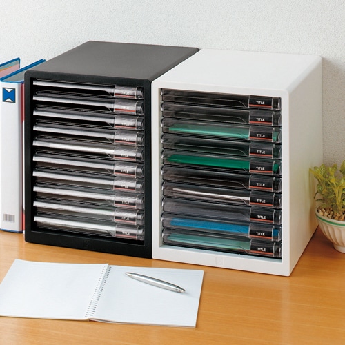 - ●書類や小物を細かく整理できるレターケース●仕様/A4タテ、スリム10段●色/ダークグレー●サイズ(外寸)/W265×D350×H345mm●引出し内寸/W230×D320×H25mm●材質/本体:ハイインパクトスチロール、引出し:再生スチロール樹脂●インデックスラベル付●スリム10段、カラーはダークグレーです。●収納力と探しやすさを兼ね備えました。