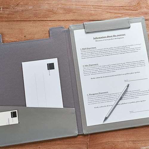 - ●マットで上質な質感で、落ち着きのある高級感を演出。●サイズ/A4●色/グレー●寸法/タテ340×ヨコ242mm●背幅/13mm●とじ具/マグネットクリップ●収容枚数/約10枚●材質/PU、ポリエステル●カバー付、グレーのクリップボード。書類や名刺が収容できるポケット付。