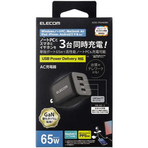 エレコム USB PowerDelivery 65W キューブAC充電器(C×2+A×1) ブラック ACDC-PD4465BK 1個(ご注文単位1個)【直送品】