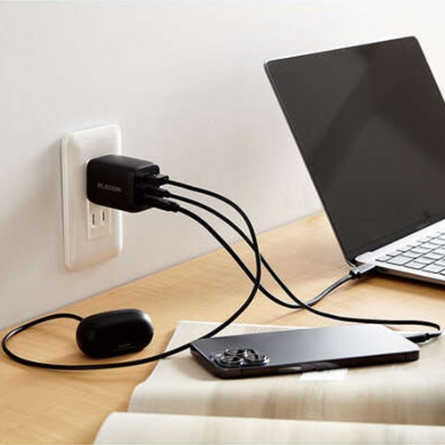 - ●USB Type-CポートとUSB-Aポートの合計3ポート搭載●コネクタ形状(本体)/USB Type-Cポート×2、USB-Aポート×1●電源/AC100~240V、50/60Hz●寸法/W約52×D38×H40.5mm●重量/約112g●色/ブラック●出力電圧/電流/3ポート同時接続時出力電圧:USB Type-C1ポート5V/9V/12V/15V/20V PPS出力3.3~16V・USB Type-C2ポート5V・USB-Aポート5V、3ポート同時接続時出力電流:USB Type-C1ポート5V/9V/12V/15V時3●USB Type-CポートとUSB Type-Aポートの合計3ポートを搭載し、iPhoneなどのスマートフォンと完全ワイヤレスイヤホンとWindowsなどのノートパソコンを3台同時充電できるGaN(窒化ガリウム)を採用したUSB AC充電器です。小型・軽量なので外出や出張などの際の持ち運びに便利です。●USB Type-Cポートは、USB Power Delivery規格、オプションのPPS(Programmable Power Supply)規格に対応し、同規格に対応するノートパソコンやスマートフォン、タブレットなどを充電可能です。●USB-Aポートは、最大出力12W(5V2.4A)でスマートフォンや完全ワイヤレスイヤホン、スマートウォッチなどを充電、給電ができます。●USB Type-Cポート単独使用時、機器に応じて出力が5V/3A、9V/3A、12V/3A、15V/3A、20V/3.25Aと可変し、iPhoneなどのスマートフォンから、iPadなどのタブレット、高性能なWindowsノートパソコンまで幅広く充電できます。●出力端子が3ポートあるので、iPhoneなどのスマートフォンと完全ワイヤレスイヤホンとWindowsなどのノートパソコンを3台同時充電できます。