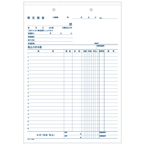 - ●A4タテ型のノーカーボン見積書●仕様/見積書、2枚複写、ノーカーボン複写、A4タテ●行数/22行●サイズ/タテ303×ヨコ210mm●とじ穴/2穴(幅80mm)●1冊=40組※2019年10月1日から施行される軽減税率制度対応商品を順次出荷しております。新仕様・旧仕様のご指定は承っておりません。