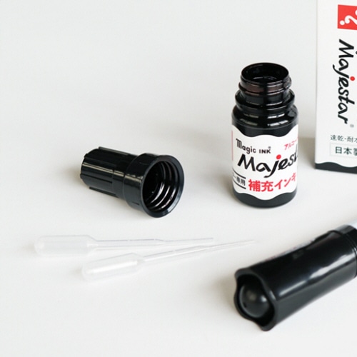 - ●マジェスター・抗菌マジェスター用の補充インキ。●インク種類/油性アルコール系インキ●インク色/黒●対応商品/マジェスター、抗菌マジェスター●内容量/10ml●専用スポイト2本付●内容量10ml、インク色は黒です。