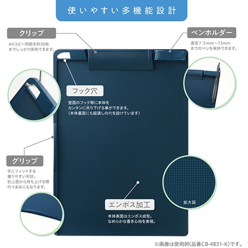 - ●問診表などの記入やアンケートの回覧に。抗菌加工を施したクリップボードです。●サイズ/A4タテ●色/ネイビー●寸法/約W232×D14×H320mm●収容枚数/A4コピー用紙約30枚●ペンホルダー対応軸径/7.5~13mm●材質/本体・クリップ:HIPS※抗菌タイプですが全ての菌の増殖を抑えるわけではありません。●A4サイズ タテ型のクリップボード、色はネイビーです。●A4コピー用紙を約30枚までしっかり保持できるクリップ付。●直径7.5~13mmまでのペンを保持できるペンホルダー付。●フック穴付きで、壁面のフック等に本体をカンタンに吊り下げることができます。●グリップは、手にフィットする握りやすい形状。机上面から持ち上げる際のつまみにもなります。●本体表面はエンボス成型。なめらかな書き心地を実現します。