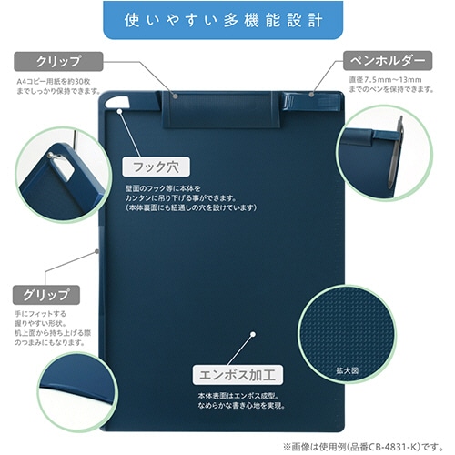 - ●問診表などの記入やアンケートの回覧に。抗菌加工を施したクリップボードです。●サイズ/A4ヨコ●色/ブラック●寸法/約W318×D14×H235mm●収容枚数/A4コピー用紙約30枚●ペンホルダー対応軸径/7.5~13mm●材質/本体・クリップ:HIPS※抗菌タイプですが全ての菌の増殖を抑えるわけではありません。●A4サイズ ヨコ型のクリップボード、色はブラックです。●A4コピー用紙を約30枚までしっかり保持できるクリップ付。●直径7.5~13mmまでのペンを保持できるペンホルダー付。●フック穴付きで、壁面のフック等に本体をカンタンに吊り下げることができます。●グリップは、手にフィットする握りやすい形状。机上面から持ち上げる際のつまみにもなります。●本体表面はエンボス成型。なめらかな書き心地を実現します。