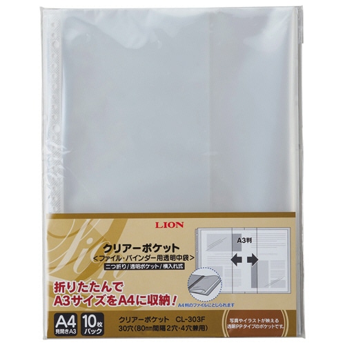 ライオン事務器 クリアーポケット(二つ折り) A4タテ(見開きA3) 2・4・30穴 台紙なし CL-303F 1パック(10枚)(ご注文単位1パック)【直送品】