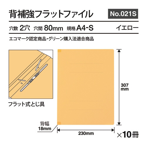 プラス 背補強フラットファイル A4タテ 150枚収容 背幅18mm イエロー No.021S 1パック(10冊)(ご注文単位1パック)【直送品】