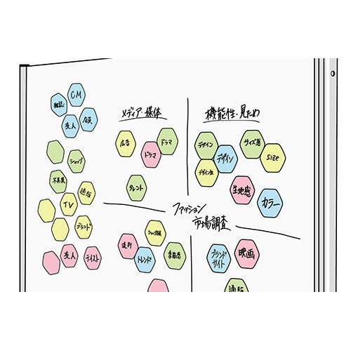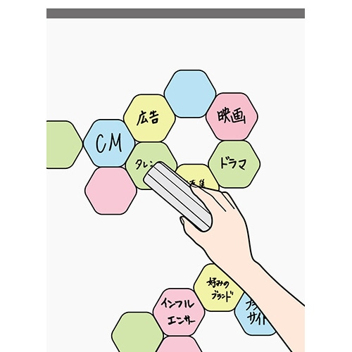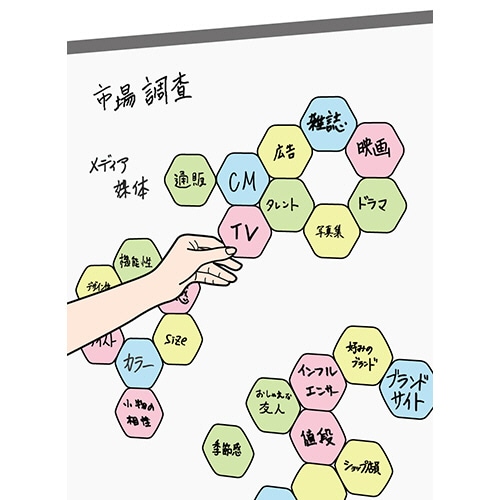 - ●ブレインストーミングに便利なホワイトボード加工の六角マグネットシート。●寸法/タテ75×ヨコ82mm●厚さ/0.7mm●ツヤ/あり●色/ブルー●材質/合成ゴムマグネット、PP用紙、フィルム●1パック=10枚※寸法は1枚あたり。●色はブルー、10枚入です。●マグネットなのでホワイトボードやスチール面で貼ったり剥がしたりが自由にできます。思考ツールとして有効に使えます。●ホワイトボードマーカーで文字を書き込めます。●ホワイトボード専用イレーザーで文字を消せます。