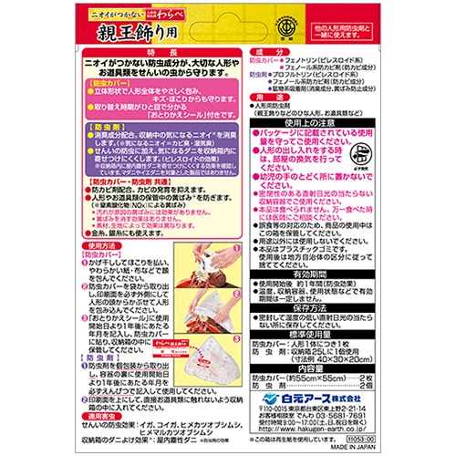 - ●雛人形、五月人形に適した人形用ケア用品。無臭タイプの防虫剤です。●効果・効能/防虫、消臭、防カビ、黄ばみ防止●対象害虫/せんいの防虫効果:イガ・コイガ・ヒメカツオブシムシ・ヒメマルカツオブシムシ、収納箱のダニよけ効果:屋内塵性ダニ(防虫剤の効果)●用途/人形用防虫剤(親王飾りなどのひな人形、お道具類など)●標準使用量/防虫カバー:人形1体につき1枚、防虫剤:収納箱25Lに1個使用(寸法例40×30×20cm)●使用可能日数/使用開始後 約1年間(防虫効果)●有効成分/[防虫カバー]フェノトリン(ピレスロイド系)・フェノール系防カ●立体形状の防虫カバー2枚と防虫剤2個のセットです。大切な人形やお道具類を、ニオイをつけずにしっかり守ります。【防虫カバー】●立体形状で人形全体をやさしく包み、キズ・ほこりからも守ります。●取り替え時期がひと目で分かる「おとりかえシール」付きです。【防虫剤】●消臭成分配合。収納中の気になるニオイを消臭します。(気になるニオイ=カビ臭・湿気臭)●せんいの防虫に加え、気になるダニを収納箱内に寄せつけにくくします。(ピレスロイドの効果)(※収納箱内に屋内塵性ダニを寄せつけにくくする効果を確認しています。マダニやイエダニを対象とした製品ではありません。)【防虫カバー・防虫剤 共通】●防カビ剤配合。カビの発育を抑えます。●人形やお道具類の保管中の黄ばみ※を防ぎます。(※窒素酸化物(NOx)による黄ばみ)●金糸、銀糸にも使えます。●他の人形用防虫剤と一緒に使えます。
