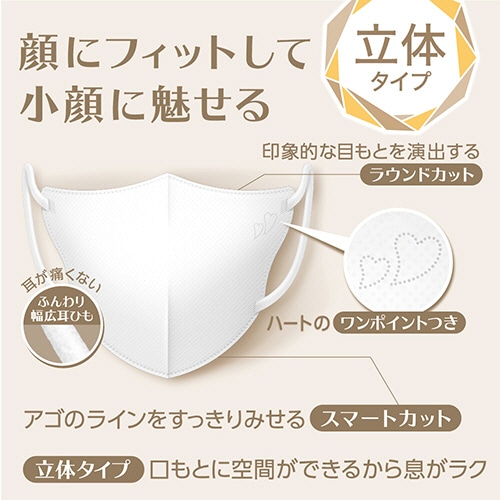 ●見た目スッキリ、きれいにフィット。唇が触れにくい立体タイプです。●マスク形状/立体型●サイズ/ふつう●寸法/138×105mm●色/プレミアムホワイト●BFE/≧95%●PFE/≧95%●材質/本体・フィルタ部:ポリプロピレン・ポリエチレン・ポリエステル、耳ひも部:ナイロン・ポリウレタン●生産国/中国●VFE/≧95%●JIS T 9001 一般用マスク●1箱=20枚※寸法は折りたたみ時※化粧が全く付着しないものではありません。化粧品の種類や使用量によっては、付着する場合が●印象的な目もとを演出するラウンドカット、アゴのラインをスッキリ見せるスマートカットで美しいフェイスラインをつくります。色はプレミアムホワイト、20枚です。●メイクがつきにくい、ふわっとしたやさしい肌ざわりの口もと素材(エアスルー製法)を採用しています。●耳が痛くないふんわり幅広耳ひも。●ハートのワンポイントつき。
