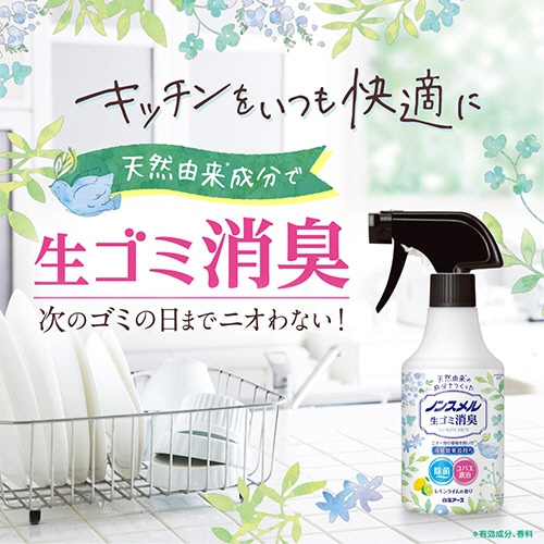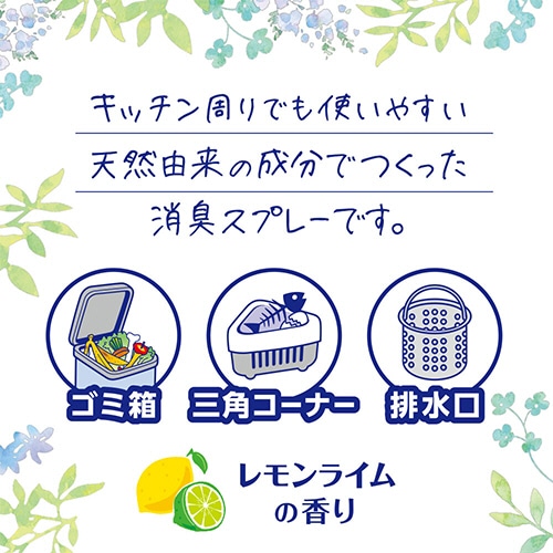 - ●ゴミ箱や三角コーナー、排水口の気になる生ゴミ臭を消臭。ニオイ菌の増殖を防ぎ消臭効果が長持ちします。コバエ対策にも。●香り/レモンライムの香り●内容量/300ml●使用推奨空間/ゴミ箱、三角コーナー、排水口など●成分/植物性ポリフェノール消臭・除菌剤、植物性香料、ターピネオール(植物由来成分)、エタノール●キッチン周りでも使いやすい、天然由来成分(有効成分・香料)使用の消臭剤です。●ニオイの元となる菌を除菌。また菌の増殖を防ぐ効果でスプレーした後3~4日間、ニオイの発生を抑えます。(※全ての菌に効果があるわけではありません。)●生ゴミの上に集まったコバエ(ショウジョウバエ)に直接スプレーして退治できます。●さわやかなレモンライムの香り。
