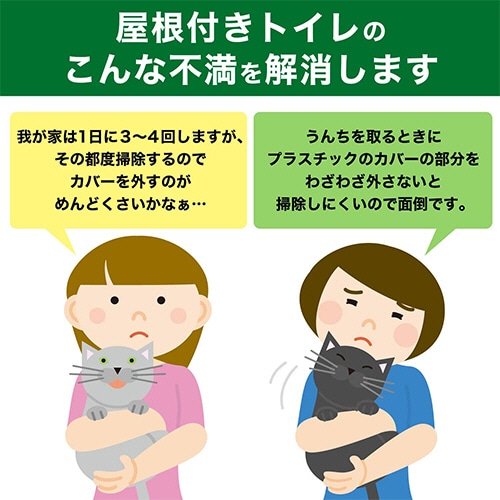 - ●リビングに置いてもニオわない!●種類/システムトイレ●寸法/約W45.5×D58×H43cm●色/ルーフカバー:グレー●材質・素材/足置き・トイレ下部・シートトレイ・スコップ:ポリプロピレン、スノコ:ポリプロピレン・北海道産トドマツ針葉粉体、ルーフカバー生地:ポリエステル、嵌合部:ABS、骨組み・フック:POM●製造国/日本●セット内容/ルーフカバー(上部)、スノコ、足置き、トイレ下部、シートトレイ、ウンチ用スコップ、実感消臭チップ2.5L、実感消臭シート4枚●成分/[実感消臭チップ]北●すぐに使える約1ヵ月分セットです。(猫ちゃん1頭の場合)●天然の本格消臭成分、北海道産モミの木(トドマツ)の粉体を、汚れやニオイが気になるスノコ部分に配合。専用のチップとシートを合わせて使うことで、トリプルで高い消臭効果を発揮します。●開閉が自由で、インテリアにもなじむスマートなデザインなので、リビング使いにおすすめです。●ルーフカバーは、閉じることでチップの飛び散りとニオイの広がりを抑えます。フルオープンにできるので、排泄の処理や砂のお掃除が楽にできます。●ルーフカバーは、汚れやニオイがつきにくい防汚・防臭抗菌加工で、取り外しも可能なので、汚れが気になったときは、簡単に水洗いすることができます。(※すべての菌に効果があるわけではありません。)