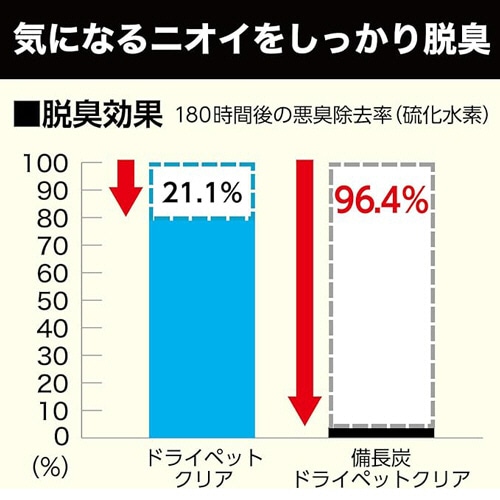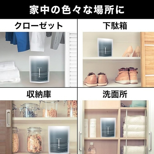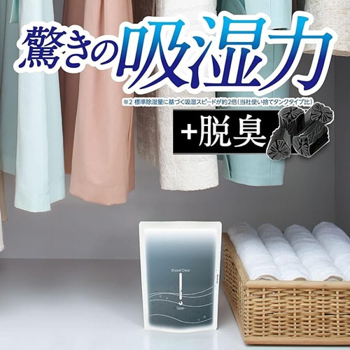 - ●スッキリ置ける&ゴミが少ないスタンドパック容器。●用途/押入れ、クローゼット、下駄箱、収納庫、流しの下、洗面所などの室内の収納空間の湿気とりに。●除湿量/約350ml●目安使用期間/1~2ヵ月●寸法/W約150×D50×H200mm●材質/塩化カルシウム、保水剤、活性炭、備長炭●シリーズ名/ドライペット※除湿量(水換算)は25℃、湿度80%の場合※目安使用期間は同じ使用場所でも季節や湿気の状態によって異なります。●使用期間は1~2ヵ月。●驚きの吸湿力+脱臭。吸湿スピード約2倍のパワフル除湿で湿気を取ります。(メーカー使い捨てタンクタイプ比)●備長炭と活性炭が気になるニオイを脱臭します。(国産備長炭使用)●収納空間にスッキリ置ける、スリム&スタイリッシュなデザイン。