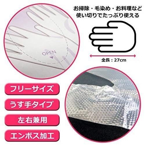 - ●【食品衛生法適合】お掃除・毛染め・お料理など使いきりでたっぷり使える。●サイズ/フリーサイズ●寸法/全長27cm●食品衛生法/適合●左右兼用/兼用●エンボス加工/外エンボス●色/透明●材質/ポリエチレン●生産国/中国●1箱=100枚●エンボス加工ではめやすくぬぎやすい。●左右兼用で経済的。●使いきりタイプ。