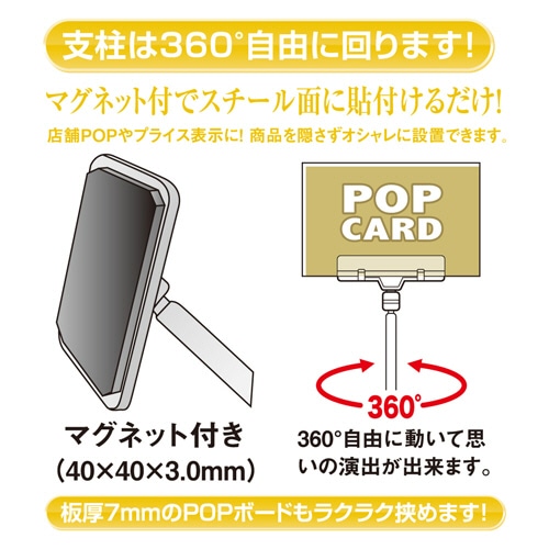 - ●店舗POP等に商品を隠さずに設置!●サイズ/M●色/ホワイト・クリア●寸法/W60×H107mm●材質/クリップ:PC、ジョイント:POM、バネ:ステンレス、ポール:PS、ベース:ABS、マグネット:マグネットシート●ベース部寸法/W45×D45mm●マグネット部寸法/W40×D40×H3.0mm●生産国/日本●1セット=10個●マグネットでスチール面に貼付けるだけで簡単にPOPを設置できます。Mサイズ、10個セットです。●支柱は360°自由に回ります。●店舗POPやプライス表示に商品を隠さずオシャレに設置!●いろいろな角度に回転します。●板厚7mmのPOPボードもラクラク挟めます。