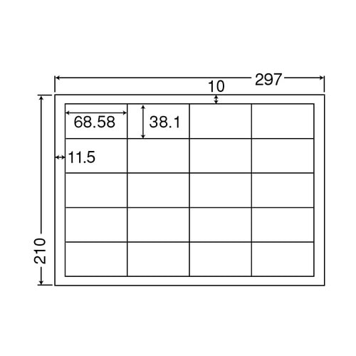 ●大量のDM発送などに便利な、ラベル用紙の業務用パック●シートサイズ/A4(297×210mm)●ラベルサイズ/68.58×38.1mm●面付け/20面(4列×5段)●紙質/上質紙●坪量/-●総厚み/約0.13mm●1セット(500シート入×5箱)●コピー機のほか、モノクロレーザープリンタ、インクジェットプリンタ(モノクロ印刷のみ)にも対応しております。※2013年11月以降順次、やや白い紙に変わります。