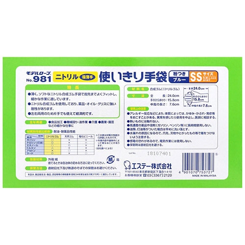 エステー モデルローブ No.981 ニトリル使いきり手袋(粉付) SS ブルー 1セット(300枚:100枚×3箱)(ご注文単位1セット)【直送品】